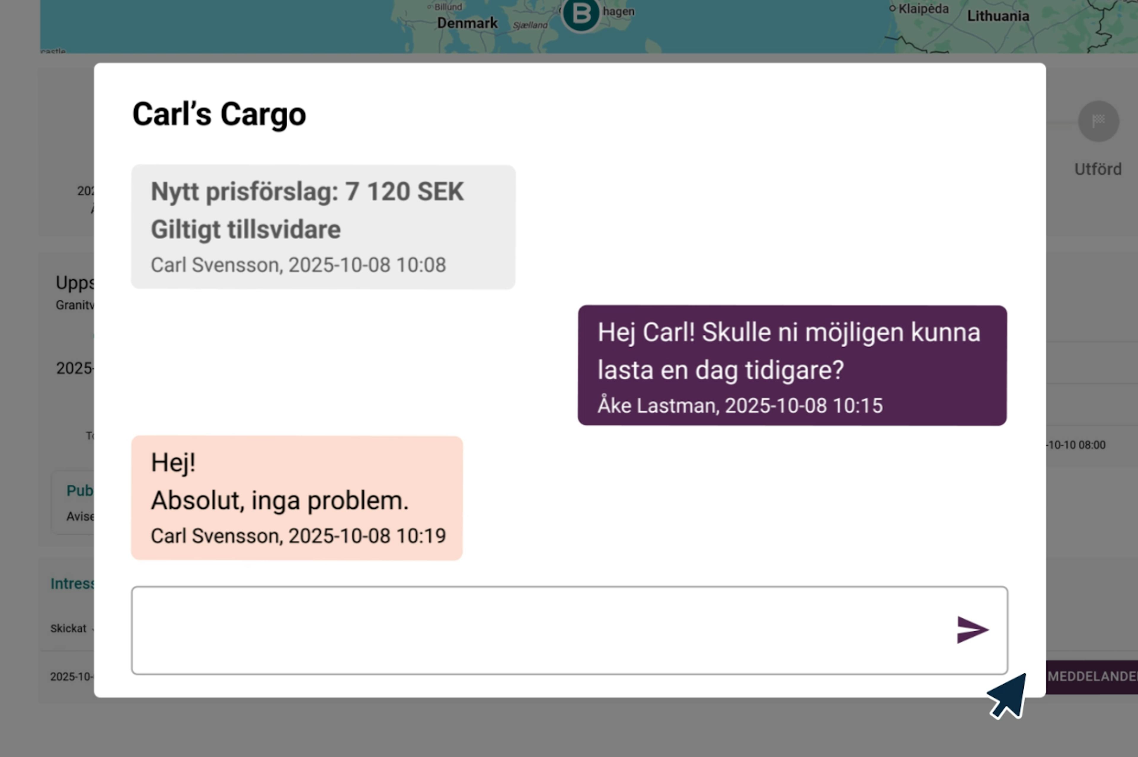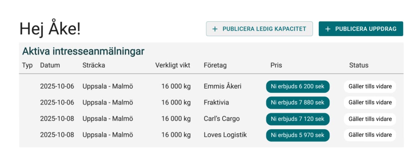 Du kan också se aktuella uppdrag som publiceras av andra och få notiser via e-post, sms eller push när nya förfrågningar matchar dina sträckor. När ett uppdrag passar din rutt eller kapacitet kan du snabbt lämna ett anbud direkt i plattformen, utan mellanhänder..